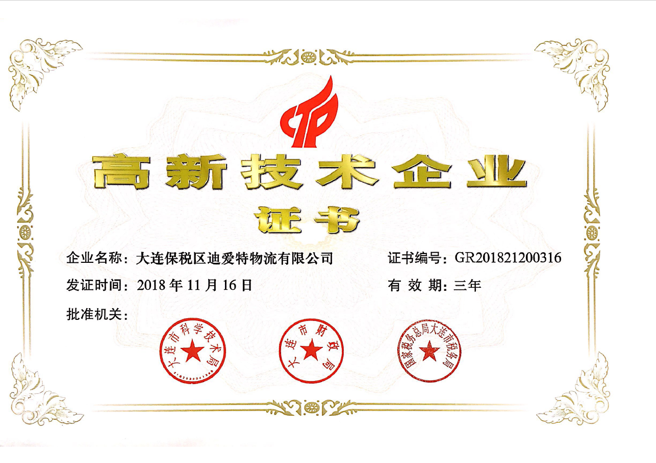 根據《高新技術企業認定管理辦法》(國科發火〔2016〕32號)和《高新技術企業認定管理工作指引》(國科發火〔2016〕195號)有關規定,大連保稅區迪愛特物流有限公司被認定為高新技術企業
